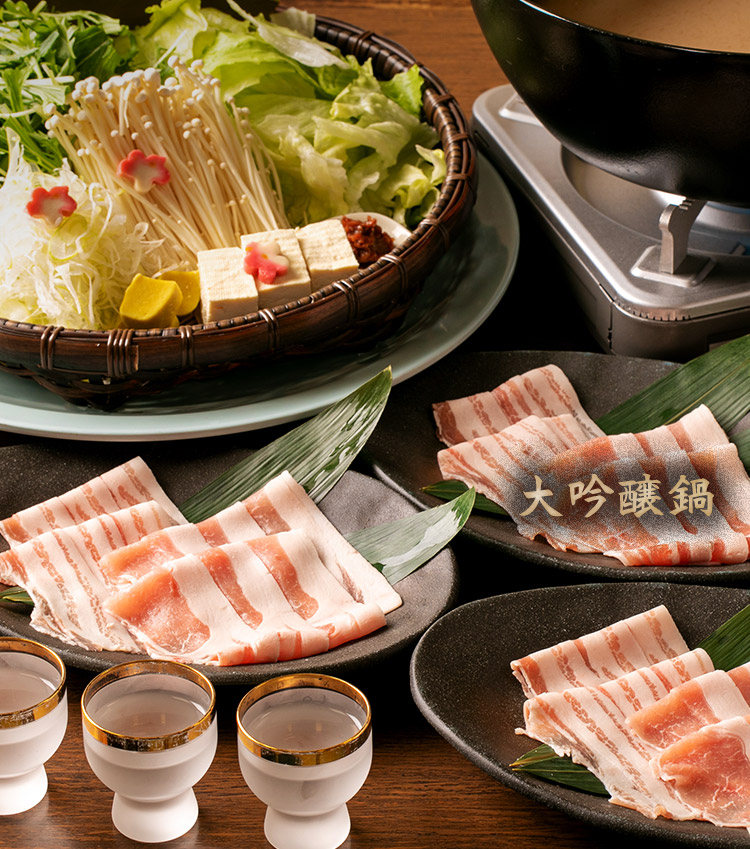 出荷数の限られた希少な金華豚は、旨味の強さとほのかに甘い脂が特徴。特別に卸していただいているロースとバラとを当店の名物、大吟醸を使ったしゃぶしゃぶでお楽しみください。